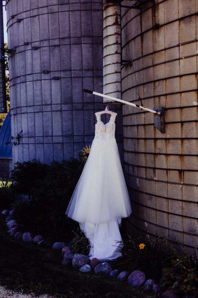 Morning light stretched over the countryside, spilling across weathered barns and quiet fields. Mimi’s wedding gown hung gracefully against the curved silo wall — lace details catching the soft golden light, tulle layers swaying gently in the breeze. The farm’s rustic charm made the perfect backdrop for her timeless bridal style: romantic, elegant, and beautifully her.