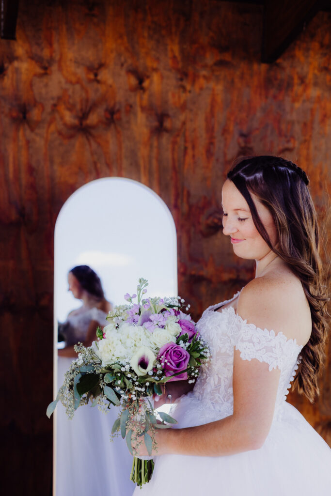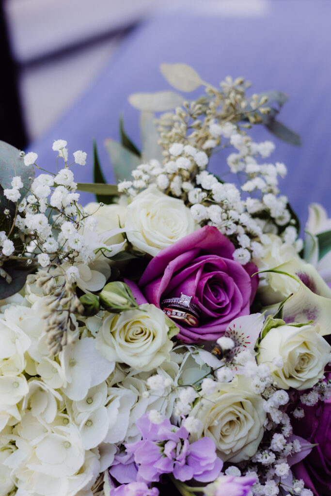 Inside, there was a calm excitement as Mimi got ready with her loved ones. She smiled through happy nerves, her hands steady as she held her bouquet — a stunning combination of white hydrangeas, lavender roses, calla lilies, and delicate greenery. The arrangement was soft, fragrant, and perfectly matched the day’s palette of lilac, ivory, and natural tones.