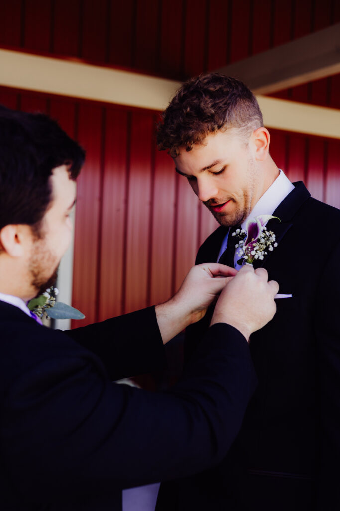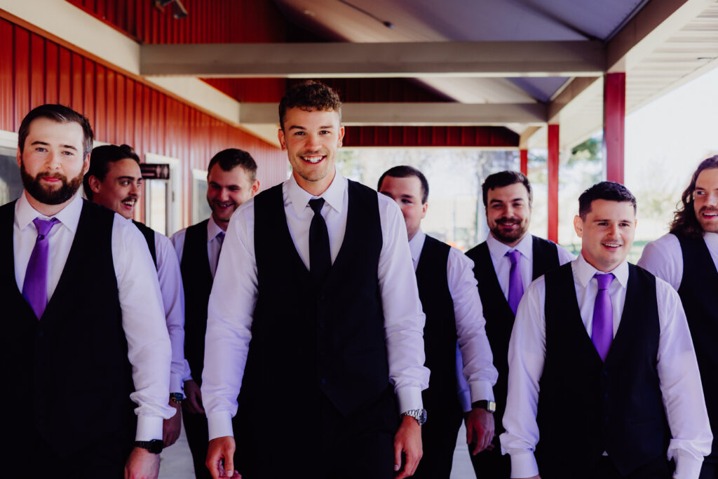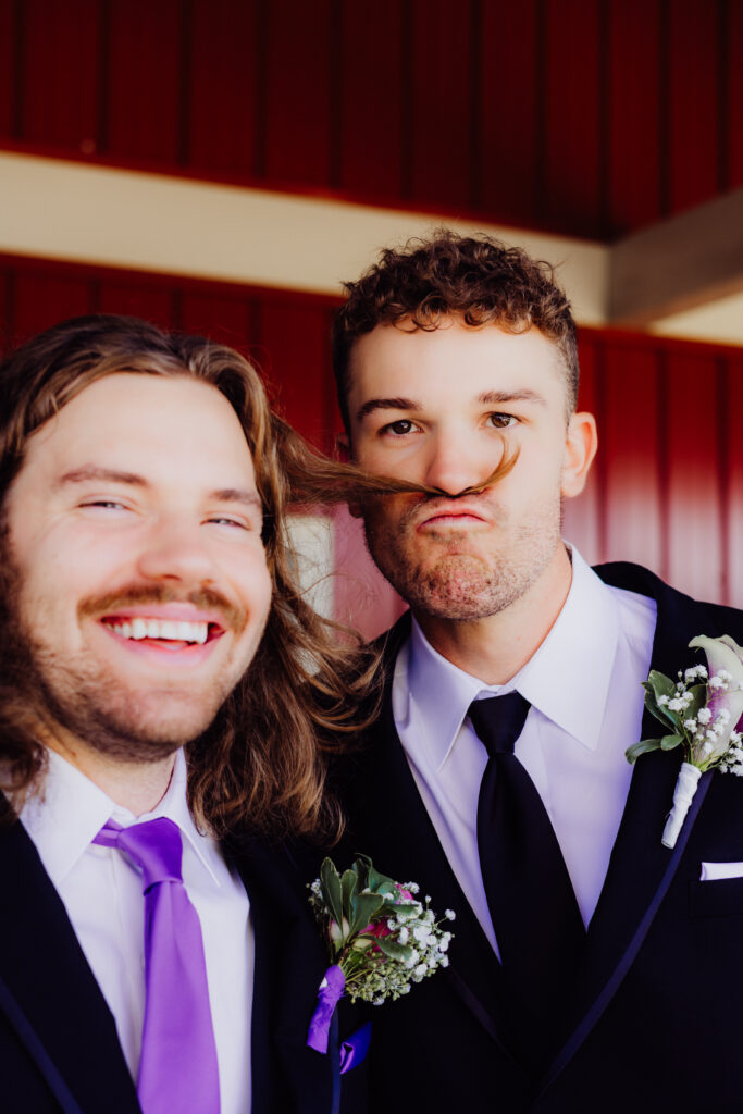 A few barns over, Roger and his groomsmen were having a very different kind of morning. Dressed in classic black suits and lavender ties, they joked, laughed, and made sure every photo captured their contagious energy. At one point, Roger even turned his best friend’s hair into a makeshift mustache — one of those hilarious, unscripted moments that tell you exactly who these people are: fun-loving, close-knit, and ready to celebrate.