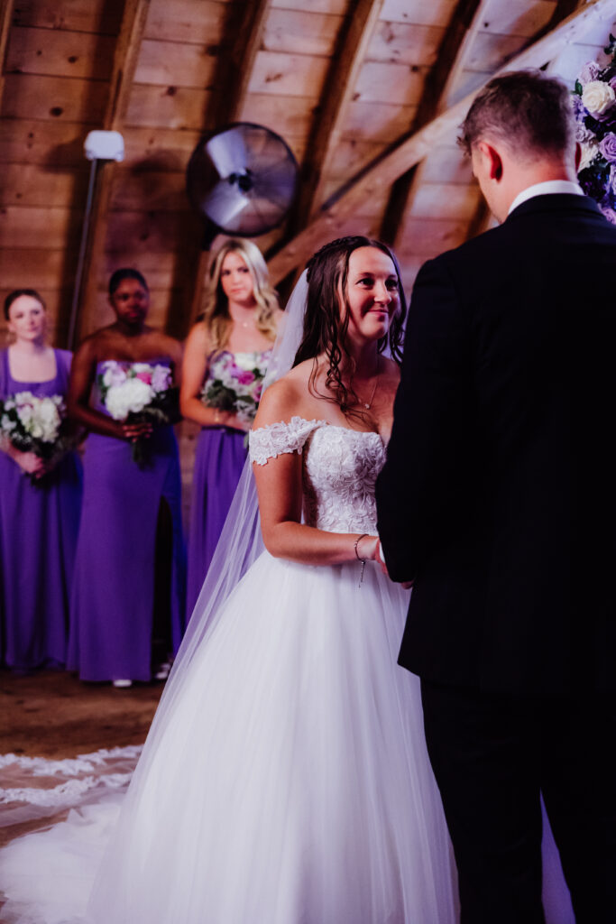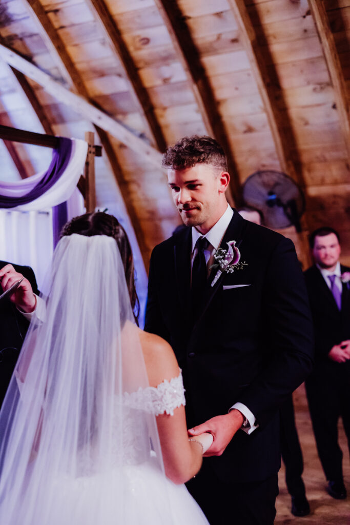 Prairie Creek Farm’s arched barn is one of those spaces that truly takes your breath away. With its towering wooden beams, warm amber tones, and glowing chandeliers, it felt like stepping into something sacred yet cozy — a place built for memories. Guests filled the rows, their voices hushed with anticipation as the music began.