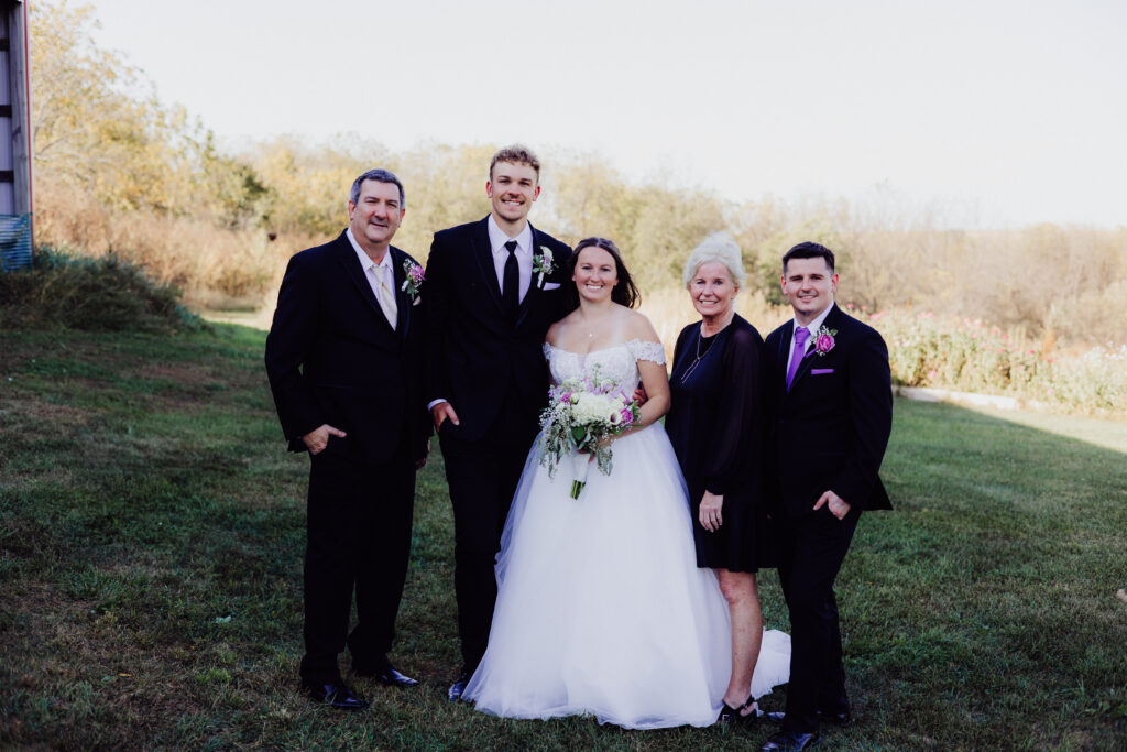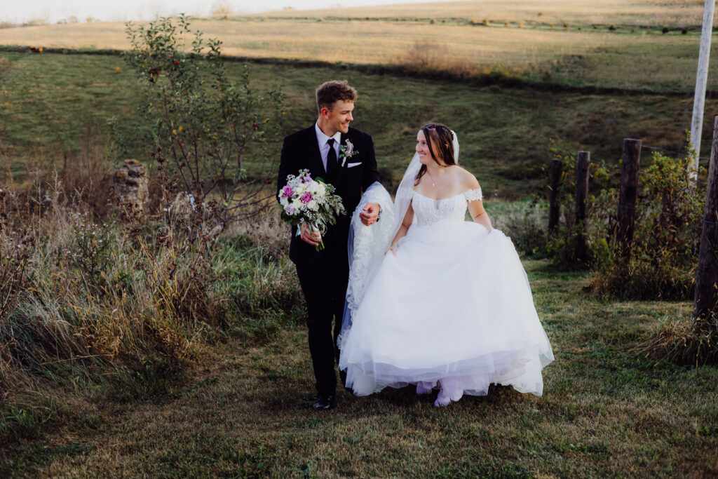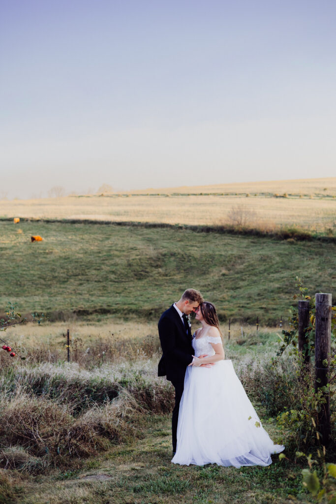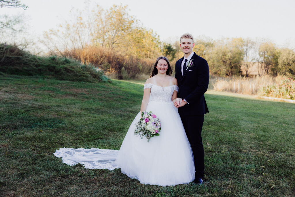 After the ceremony, the newlyweds stepped into the soft afternoon light, surrounded by the rolling farmland that gives Ridgeway its postcard-perfect beauty. The golden hues of early fall wrapped around them as we captured portraits that felt both cinematic and completely natural.