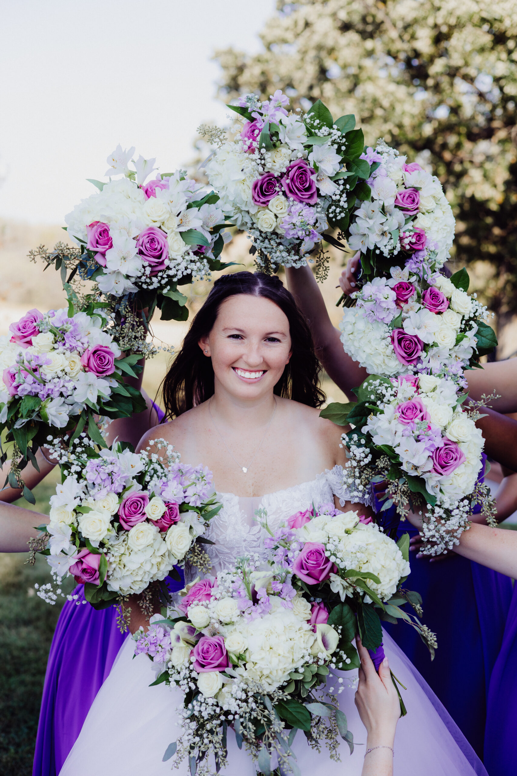 Inside, there was a calm excitement as Mimi got ready with her loved ones. She smiled through happy nerves, her hands steady as she held her bouquet — a stunning combination of white hydrangeas, lavender roses, calla lilies, and delicate greenery. The arrangement was soft, fragrant, and perfectly matched the day’s palette of lilac, ivory, and natural tones.