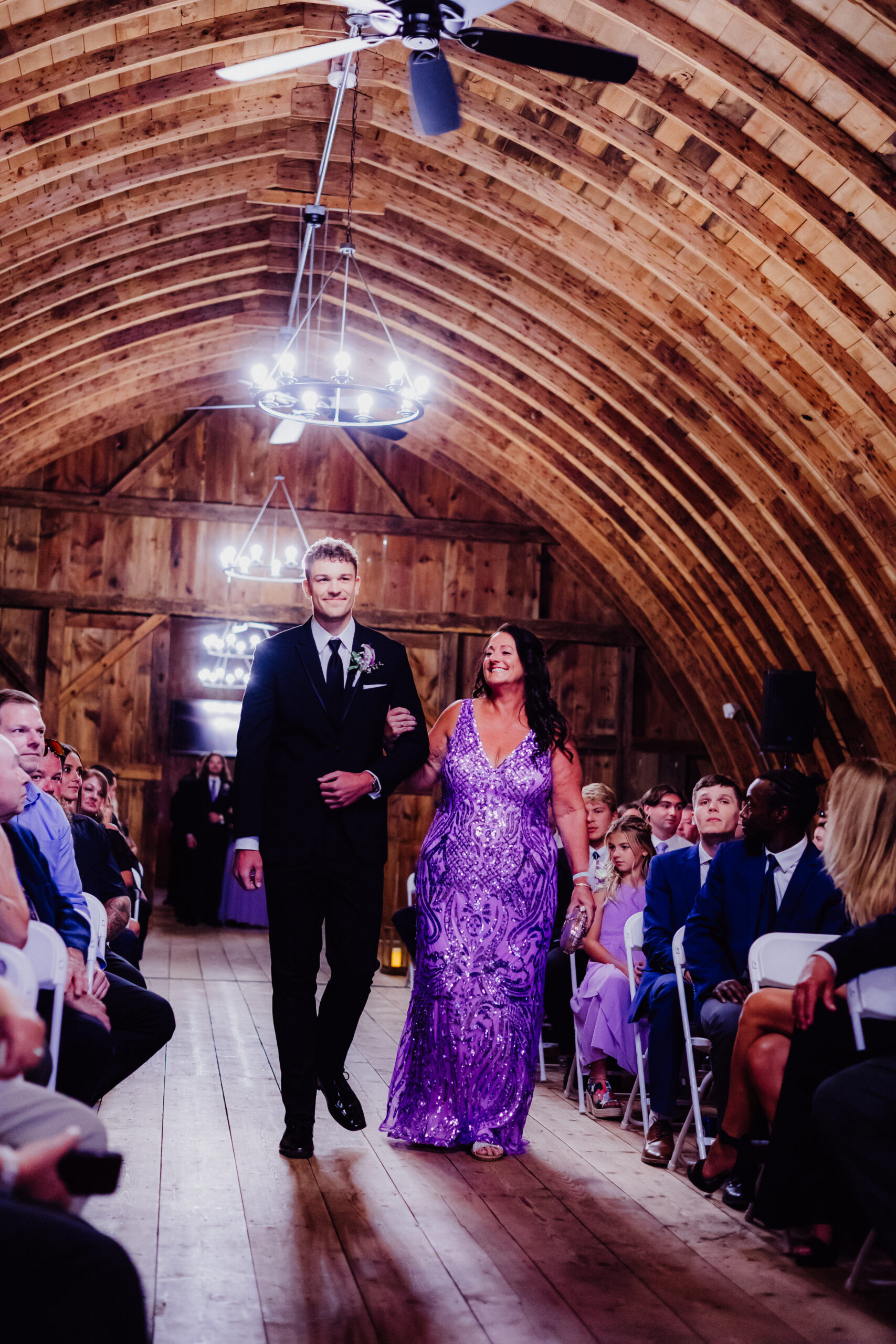 Prairie Creek Farm’s arched barn is one of those spaces that truly takes your breath away. With its towering wooden beams, warm amber tones, and glowing chandeliers, it felt like stepping into something sacred yet cozy — a place built for memories. Guests filled the rows, their voices hushed with anticipation as the music began.